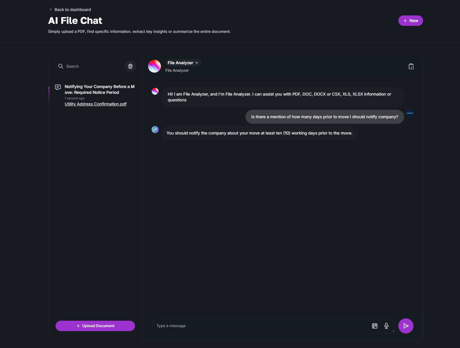 AI File Chat analyzes any document you upload, and provides answers or summaries as requested.
